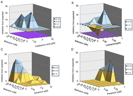 Finally, we examined the inhibitory effects of the combination of baloxavir and NAIs on influenza A and B viruses in vitro using an 8 × 6 combinatorial design by monitoring CPE in MDCK cells. The data were plotted and analyzed using the MacSynergy II software. The results indicate that baloxavir combined with zanamivir significantly prevented influenza B virus infection-induced CPE in a dose-dependent manner (Figure 4C). While baloxavir combined with oseltamivir acid or peramivir slightly prevented influenza B virus-induced CPE (Figure 4A,D), baloxavir combined with laninamivir did not prevent influenza B virus-induced CPE (Figure 4B). For the combination of baloxavir with zanamivir, the volume of synergy was 137.14 µM2%, respectively, at 95% confidence levels, which suggested strong synergy effects against influenza B virus in vitro. On the other hand, the combination of baloxavir with oseltamivir acid or peramivir showed a synergy volume of 76.70 µM2% or 82.03 µM2%, respectively, at 95% confidence levels, which is defined as a moderate synergy effect against influenza B virus in vitro (Table 4). Moreover, we found that baloxavir combined with oseltamivir acid, laninamivir, and zanamivir significantly prevented H3N2 infection-induced CPE in a dose-dependent manner (Figure 5A–C), whereas baloxavir combined with peramivir slightly prevented H3N2-induced CPE (Figure 5D). For the combination of baloxavir with oseltamivir acid, laninamivir, and zanamivir, the volume of synergy was 191.02 µM2%, 268.57 µM2%, or 155.61 µM2%, respectively, at 95% confidence levels, which suggested strong synergy effects against H3N2 in vitro. For the combination of baloxavir with peramivir, the volume of synergy was 97.97 µM2%, respectively, at 95% confidence levels, which would be defined as a moderate synergy effect against H3N2 in vitro (Table 5). These results indicate that the co-administration of baloxavir and NAIs exhibited synergistic effects in suppressing influenza B and A viruses.