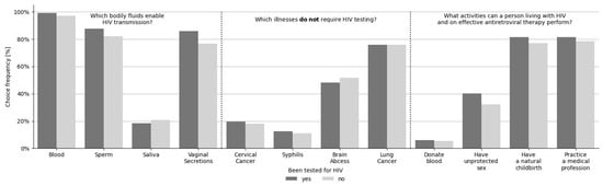 People who had never been tested for HIV were significantly younger than those who had been tested (20, [IQR: 19–22 years] vs. 21, [IQR: 20–23 years]; p = 0.0001), were more likely to be female (295/418, 70.57% vs. 66/114, 57.89%; p = 0.010), and were students who had not yet begun clinical classes at university (282/417, 67.63% vs. 57/111, 51.35%; p = 0.001). They were also significantly less likely to know someone living with HIV (31/418, 7.42% vs. 30/114, 26.32%; p = 0.0001), to suggest someone take an HIV test (105/418, 25.12% vs. 73/114, 64.04%; p = 0.0001), or to have heard about the U=U principle (60/418, 14.35% vs. 31/113, 27.43%; p = 0.001). There were only two significant differences between the two groups regarding knowledge of HIV risk and testing guidelines. People who had never been tested for HIV were less likely to correctly identify the infectious body fluids that enable HIV transmission (236/418, 56.46% vs. 79/114, 69.30%; p = 0.013) or the activities in which a person with HIV on effective antiretroviral therapy could engage (99/414, 23.91% vs. 38/114, 33.33%; p = 0.042). A comparison of the responses to the multiple-choice questions is shown in Figure 1 and Figure 2.
