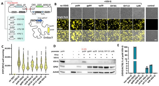 - Bruder, M.R.; Aucoin, M.G. Utility of Alternative Promoters for Foreign Gene Expression Using the Baculovirus Expression Vector System. Viruses 2022, 14, 2670. [Google Scholar] [CrossRef]