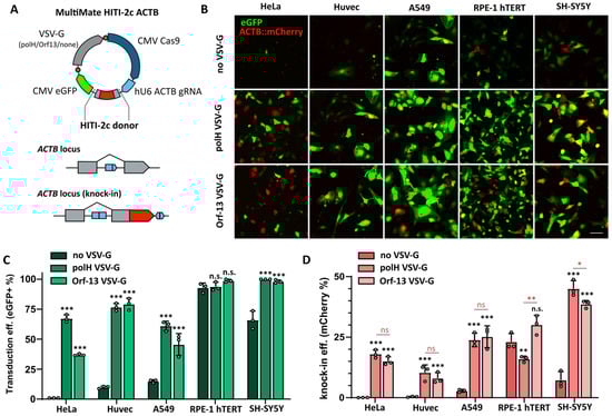 - Capin, J.; Harrison, A.; Raele, R.A.; Yadav, S.K.N.; Baiwir, D.; Mazzucchelli, G.; Quinton, L.; Satchwell, T.J.; Toye, A.M.; Schaffitzel, C.; et al. An engineered baculoviral protein and DNA co-delivery system for CRISPR-based mammalian genome editing. Nucleic Acids Res. 2024, 52, 3450–3468. [Google Scholar] [CrossRef]