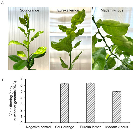 Disease symptoms triggered by a citrus yellow vein clearing virus (CYVCV) California-Hacienda Heights isolate in different citrus host. (A) A typical branch of Sour orange (Citrus aurantium L.), Eureka lemon (Citrus limon) and Madam vinous (Citrus sinensis (L.) Osbeck) plants exhibiting typical CYVCV-induced yellow vein clearing phenotype at three months post-graft inoculation in the greenhouse. (B) Absolute quantification of virus titers in the three hosts present in (A) by RT-qPCR. Three biological replicates yielded consistent results.