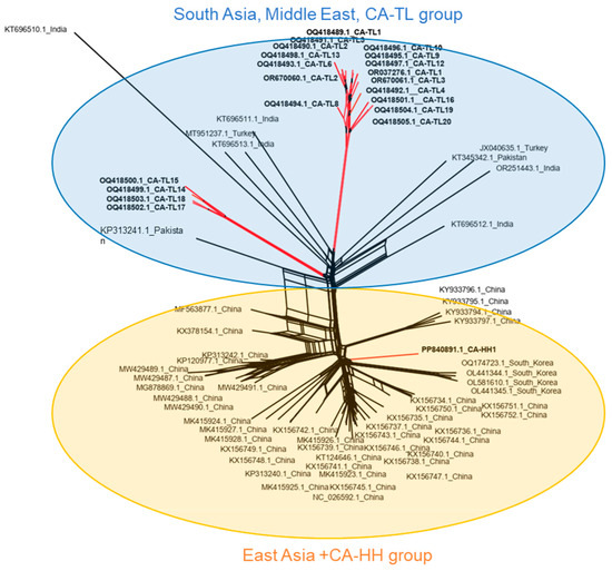 Construction of non-rooted Neighbornet phylogenetic tree upon 76 citrus yellow vein clearing virus (CYVCV) whole genome sequence. Briefly, CYVCV isolates could be divided into two major genotype groups. The isolates detected from South Asia (India and Pakistan), Middle East (Turkiye), and California-Tulare were grouped together (Light blue shade). The other isolates from East Asia (China and South Korea) and California-Hacienda Heights were grouped together (Light orange shade). The lineages of CYVCV CA isolates are marked red.