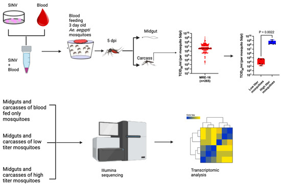 A schematic diagram showing the experimental setup used in this study. SINV was mixed with sheep blood and used to orally infect 3-day-old mosquitoes. At 5 days post blood meal, the mosquitoes were dissected into midguts and carcasses. Portions of the carcass samples were used to determine the titer of SINV in order to identify low titer and high titer mosquitoes. Poly(A)+ RNA was then isolated from the midguts and the remaining portions of the carcass samples from six low titer and six high titer samples, as well as from the midguts and carcasses of three control mosquitoes that were fed only blood, and the RNA was used to generate sequencing libraries that were then subjected to Illumina sequencing and analysis. The figure was generated using BioRender (https://www.biorender.com) (accessed on 17 September 2024). Some of the images in the figure were previously published [22].