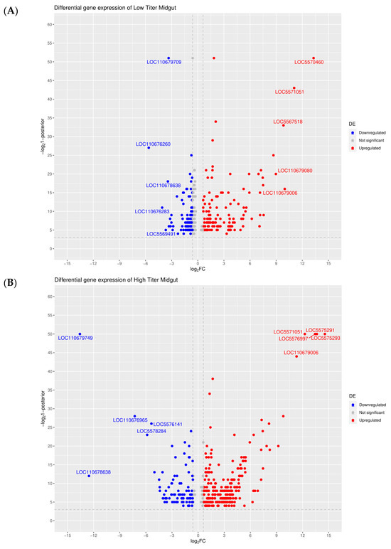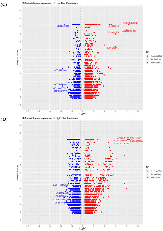 Volcano plot analysis of DEGs observed in (A) low titer midguts, (B) high titer midguts, (C) low titer carcasses, and (D) high titer carcasses (all relative to blood-fed ones). RefSeq identifiers are provided for the top five upregulated or downregulated DEGs in each category.