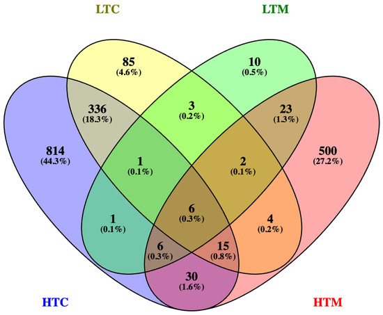 Venn diagram showing the numbers of DEGs with ≥two-fold expression difference (compared to blood-fed ones) that were unique or shared between low titer carcasses (LTC), low titer midguts (LTM), high titer carcasses (HTC), and high titer midguts (HTM).