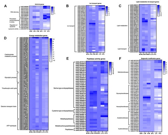 Heatmaps of DEGs involved in (A) antiviral activity, (B) ion transport, (C) lipid metabolism and transport, (D) energy metabolism, (E) peptidase activity, and (F) epigenetic modification. The averages of the gene matrix data were log2 transformed before they were used to generate the heatmaps.