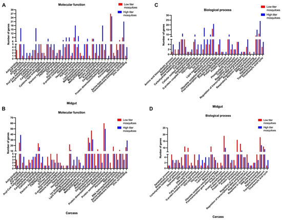 GO term analysis of (A) molecular functions of upregulated DEGs in midguts of low titer and high titer mosquitoes, (B) molecular functions of upregulated DEGs in carcasses of low titer and high titer mosquitoes, (C) biological processes of upregulated DEGs in midguts of low titer and high titer mosquitoes, and (D) biological processes of upregulated DEGs in carcasses of low titer and high titer mosquitoes. GO terms were analyzed using VectorBase.