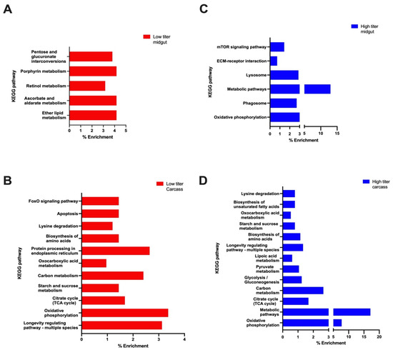 KEGG pathway analysis of (A) low titer midguts, (B) low titer carcasses, (C) high titer midguts, and (D) high titer carcasses.