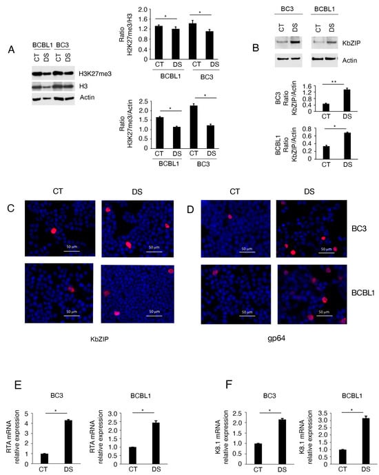 We evaluated if valemetostat DS3201 (DS), a small molecule able to inhibit Enhancer of Zeste Homolog 2 (EZH2) activity, could trigger the lytic cycle activation of KSHV in BC3 and BCBL-1, PEL cells that harbor the virus in a latent state. To assess DS activity, we investigated the reduction of H3K27me3 in PEL cells (Figure 1A). Similar to what has been reported for JSC1 [11], a PEL cell line double-infected by Kaposi sarcoma associated herpesvirus (KSHV) and Epstein-Barr virus (EBV), we found that the KSHV lytic cycle was induced in both BC3 and BCBL-1 cells after 24 h of treatment at a 1 µM dose, based on the expression of early lytic antigen basic region leucine-zipper protein (KbZIP) as assessed by Western blot analysis (Figure 1B). These results were confirmed by IFA experiments, in which we observed that cells expressed KbZIP (encoded by K8) (Figure 1C), and by Real Time quantitative PCR (RT-qPCR), in which we found that DS-treated cells express RTA and K8.1 (Figure 1E,F). Furthermore, the expression of the late lytic antigen p64 (encoded by K8.1) was induced by DS in PEL cells (Figure 1D), suggesting that EZH2 inhibition led to a complete lytic cycle activation in these cells.