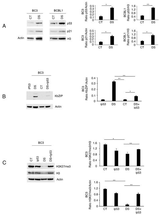 Several studies, performed in our laboratory and others have highlighted that treatments that lead to wtp53 activation promote KSHV replication in PEL cells [15,16,18]. It has also been reported that the depletion of EZH2 may be accompanied by an increase in wtp53 stability [12]. Therefore, here we investigated if DS could activate wtp53 and if its activation could contribute to lytic cycle induction. As shown in Figure 2A, the wtp53 expression level increased, and its target p21 was activated in BC3 and BCBL-1 cells undergoing DS treatment for 24 h, the time at which KbZIP and p64 were expressed (Figure 1B,C). Despite the fact that BCBL-1 carries a monoallelic mutation of p53, we obtained similar results in response to DS treatment, which might suggest that also p73, a transcriptionally active isoform that overlaps with p53 in regulating the expression of p53-dependent genes, could play a role. To find out if the activation of the wtp53–p21 axis could play a role in KSHV lytic cycle reactivation by DS, we pharmacologically inhibited wtp53 by pretreating cells with Pifithrin-α, an inhibitor of p53-dependent transactivation. As shown in Figure 2B, this treatment reduced KbZIP expression in cells treated by DS, suggesting that wtp53 activation contributed to triggering the lytic cycle, according to the above reported studies. As wtp53 has been reported to suppress EZH2 gene expression [13], we then investigated whether wtp53 inhibition could counteract H3K27me3 demethylation mediated by DS. As shown in Figure 2C, the H3K27me3 expression level was restored in the presence of Pifithrin-α in BC3 PEL cells treated by this EZH2 inhibitor. These results suggest that a regulatory circuit between wtp53 activation and H3K27me3 demethylation sustained the KSHV lytic cycle activation in PEL cells treated by DS. This is in agreement with the above reported studies showing that wtp53 inhibited EZH2 [13] and that EZH2 inhibition was able to induce a cytotoxic effect against pancreatic cancer cells only if they carried wtp53, by inducing its activation [12].