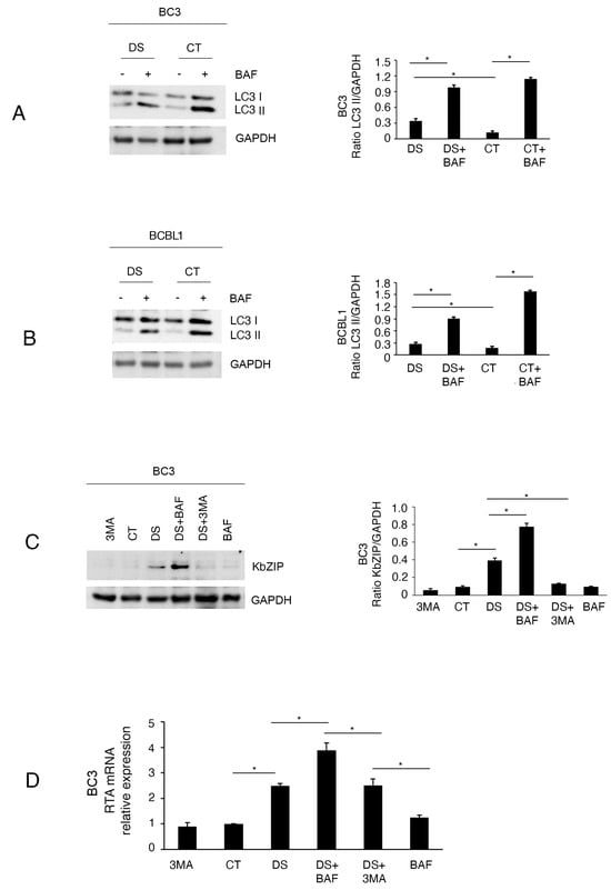 DS triggers autophagy and inhibits its final phases, which promotes the KSHV lytic cycle. (A,B) Microtubule associated protein 1A/1B light chain 3 (LC3)I/II accumulation in BC3 and BCBL-1 cells treated by DS in the presence or absence of Bafilomycin A (BAF), as evaluated by Western blotting; (C) KbZIP expression in BC3 PEL cells treated by DS in the presence or absence of 3-methyladenine (3-MA) or Bafilomycin (BAF). Bar-graphs represent the mean plus SD of proteins of interest on house-keeping proteins calculated based on three different experiments. (D) Expression of RTA, as evaluated by RT-qPCR in BC3 cells treated or not with DS in the presence or absence of 3-MA or Bafilomycin (BAF). The difference was considered statistically significant when the p-value was: * < 0.05.