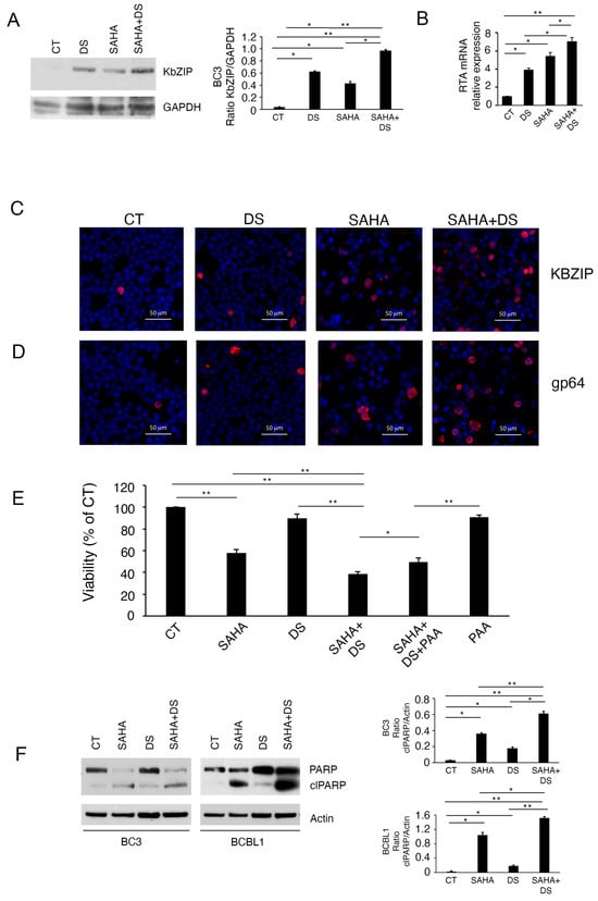 DS increases the activation of the viral lytic cycle and the cytotoxic effect induced by suberoylanilide hydroxamic acid (SAHA). BC3 PEL cells, treated by DS, SAHA or combination of both were investigated (A) for the expression of KbZIP by Western blot analysis; (B) for the expression of RTA by RT-qPCR, (C) for the expression of KbZIP, and (D) gp64 by IFA, following treatment by DS in the presence or absence of SAHA; bar = 50 μM. (E) Cytotoxic effect of DS, SAHA or combination of both as evaluated by trypan-blue assay in BC3 cells after 24 h of treatment, in the absence or presence of phosphonoacetic acid PAA; (F) Poly adenosine diphosphate-ribose polymerase (PARP) cleavage in BC3 and BCBL-1 cells treated by DS, SAHA or DS/SAHA combination investigated by Western blotting. Bar-graphs represent the mean plus SD of proteins of interest on house-keeping proteins calculated based on three different experiments. The difference was considered statistically significant when the p-value was: * < 0.05; ** < 0.01.