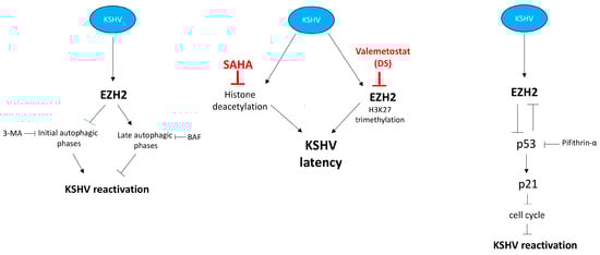 In this study, we show that Enhancer of Zeste Homolog 2 (EZH2) inhibition by valemetostat DS3201 (DS) induced the lytic reactivation of Kaposi sarcoma associated herpesvirus (KSHV) from latency in BC3 and BCBL-1 primary effusion lymphoma (PEL) cells and unveil new molecular mechanisms involved in this effect. Indeed, we found that DS activated wtp53 and promoted the initial phases of autophagy, both effects contributing to KSHV lytic antigen expression (Figure 5). Accordingly, EZH2 methyltransferase has been previously shown to regulate the autophagic process [19]. Epigenetic changes are among the most important mechanisms through which viruses, particularly those persisting in the infected host, restrict viral protein expression and maintain latency, which together with other strategies, may help them to avoid immune recognition [24]. Through epigenetic changes, viruses also dysregulate the expression of cellular genes, once infection is established [25]. For example, EZH2 and c-Myc upregulation by human Cytomegalovirus (HCMV) contributes to viral-driven oncogenesis [26,27]. In the specific case of KSHV, it has been reported that the latent protein viral FLICE-inhibitory protein (v-FLIP) upregulated EZH2 in human endothelial cells, which contributed to angiogenesis [28].