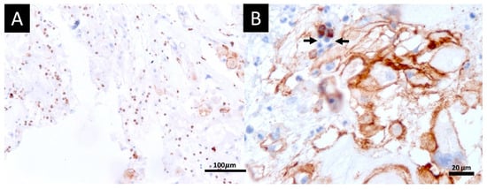 (A) Positive CD68 immunohistochemistry stain (marked in brown) showing tumor-infiltrating macrophages. (B) Positive CD56 immunohistochemical stain (marked in brown) in chordoma cells and negative stain of abundant stromal inflammatory cells (marked in blue). Two positive CD56 lymphocytes (arrows) are shown, which may be NK cells.