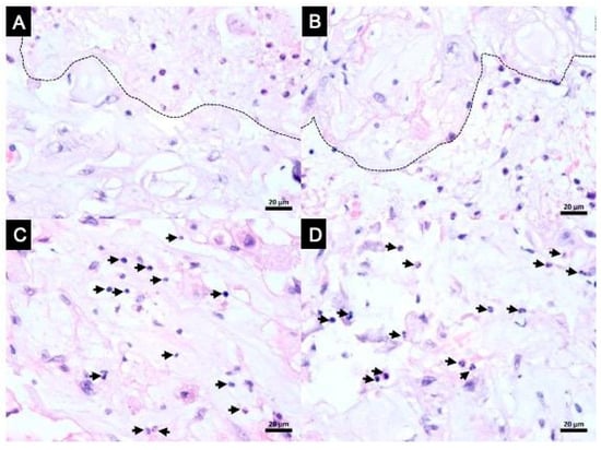 (A) H&E stain showing dotted line that separates the necrotic area with tumoral cells undergoing karyolysis under the line and the adjacent infiltrated area of tumoral inflammatory cells above the line. (B) H&E stain showing dotted line that separates the necrotic area with eosinophilic cytoplasm above the line and adjacent infiltrated area of tumoral inflammatory cells under the line. (C) H&E stain showing abundant tumor-infiltrating inflammatory cells (arrows). (D) Abundant tumor-infiltrating inflammatory cells (arrows).