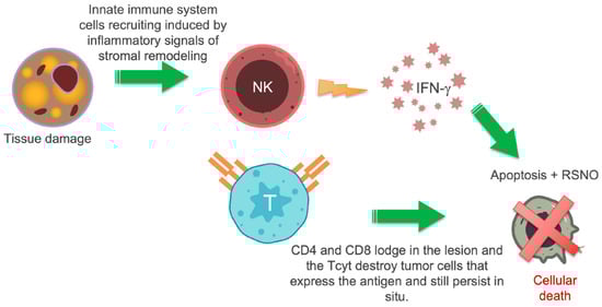Tumor immunoediting stage of elimination. RSNO: reactive species of nitrogen and oxygen. Tcyt: cytotoxic T-lymphocyte.