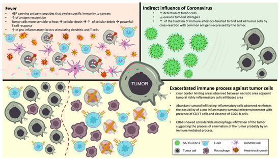 Possible mechanisms related to tumor regression: fever, indirect influence of the SARS-CoV-2 and exacerbated immune process against tumor cells.