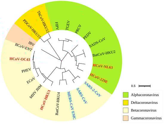 According to the International Committee on Taxonomy of Viruses (ICTV) (https://ictv.global, accessed on 30 October 2024), coronaviruses are currently categorized into four distinct genera: Alphacoronavirus, Betacoronavirus, Gammacoronavirus, and Deltacoronavirus. The coronaviruses that infect humans primarily belong to the Alphacoronavirus and Betacoronavirus genera. Specifically, HCoV-229E and HCoV-NL63 are classified under the Duvinacovirus and Setracovirus subgenera of Alphacoronavirus, respectively. In contrast, HCoV-OC43, HCoV-HKU1, SARS-CoV, MERS-CoV, and SARS-CoV-2 are classified under the Embecovirus, Merbecovirus, and Sarbecovirus subgenera of Betacoronavirus. Besides infecting humans, many members of the Alphacoronavirus and Betacoronavirus genera also infect various mammals (Figure 1). For instance, porcine coronaviruses such as porcine epidemic diarrhea virus (PEDV), transmissible gastroenteritis virus (TGEV), porcine hemagglutinating encephalomyelitis virus (PHEV), and porcine respiratory coronavirus (PRCV), along with the more recently identified swine acute diarrhea syndrome coronavirus (SADS-CoV), primarily infect pigs. Feline coronaviruses (FCoV), including feline infectious peritonitis virus (FIPV) and feline enteric coronaviruses (FECVs), infect cats, while murine coronaviruses such as murine hepatitis virus (MHV) infect mice. Gammacoronaviruses and Deltacoronaviruses are widespread globally and primarily infect wild and domestic birds. A well-studied example of a Gammacoronavirus is infectious bronchitis virus (IBV), which belongs to the Igacovirus subgenus. Additionally, porcine deltacoronavirus (PDCoV) HKU15, from the Buldecovirus subgenus within the Deltacoronavirus genus, has recently been identified in pigs [,,].
