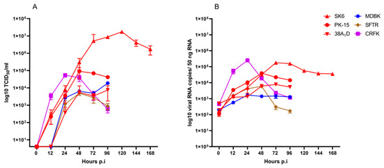 Viral growth kinetics and viral RNA synthesis in porcine, bovine, ovine, and feline cell lines infected with PhoPeV. Porcine SK6, PK-15, and 38A1D cells, bovine MDBK cells, ovine SFTR cells, and feline CRFK cells were infected with PhoPeV at an MOI of 0.1. Supernatants and cell lysates of infected cells were collected over a period of 96 hpi or 168 hpi (SK6). (A) Virus titers were determined as 50% tissue culture infectious doses (TCID50) per mL. (B) After extraction of total cellular RNA from the collected cell lysates, the viral RNA copy numbers were determined by RT-qPCR and expressed as log 10 copies per 50 ng of RNA. Each time point was evaluated in triplicates. Mean values and standard deviations were calculated by GraphPad Prism software version 9.0.0.