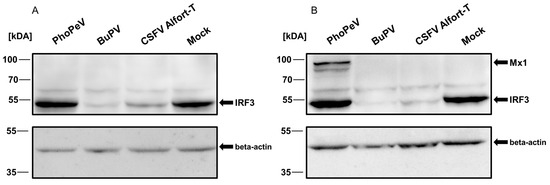 As a major difference from other pestiviruses, the viral genome of PhoPeV does not encode for the viral N-terminal protease Npro. This protein induces proteasomal degradation of IRF3, which leads to the prevention of IFN alpha/beta induction and inhibition of the expression of effector proteins encoded by interferon-stimulated genes (ISGs) such as Mx1 [41,42]. Accordingly, Npro is significantly implicated in the inhibition of cellular antiviral defense against pestiviruses. With regard to the lack of the Npro coding region in its genome, it is reasonable to speculate that PhoPeV cannot inhibit the type 1 IFN induction and expression of ISGs. To test this hypothesis, expression of IRF3 and the Mx1 protein were analyzed in porcine cells infected with PhoPeV by immunoblot. As it was previously reported that SK6 cells cannot be stimulated to produce type 1 IFN, PK-15 cells were used for these experiments [15,42]. As controls, CSFV Alfort-T and BuPV were included. Infection of PK-15 cells with the individual viruses was confirmed by IF and immunoblot analyses.