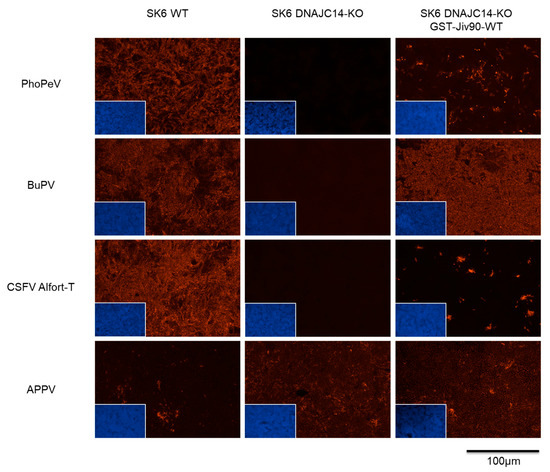 Relevance of the cellular protein DNAJC14 for viral RNA replication of PhoPeV. Cells were infected with PhoPeV, BuPV, and CSFV Alfort-T using an MOI of 1 and with APPV at an MOI of 0.1. Viral antigen was detected by immunofluorescence at 72 hpi. Virus infection of all selected viruses, in the presence of DNAJC14, was detected in the swine kidney 6 wild-type cell line (SK6 WT) and in the DNAJC14-KO rescue cells (SK6 DNAJC14-KO GST-Jiv90-WT). Similar to BuPV and CSFV, no replication of PhoPeV was detected in the DNAJC14 knock out cell line SK6 DNAJC14-KO. Only APPV infection could be detected in this knockout cell line. Viral antigens were stained with Cy3-conjugated secondary antibodies (red), and cell nuclei were stained with DAPI (blue; lower left corner). All mock controls tested negative.