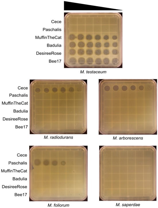 High titer lysates were diluted tenfold in phage buffer with glycerol and 3 μL of each dilution was spotted on lawns of Microbacterium spp (M. testaceum NRRL B-59317, M. arborescens NRRL B-59342, M. radiodurans NRRL B-24799, M. foliorum NRRL B-24224, M. saperdae NRRL B-14833). Plates were incubated at 28 °C for 2 days and observed for plaque formation.