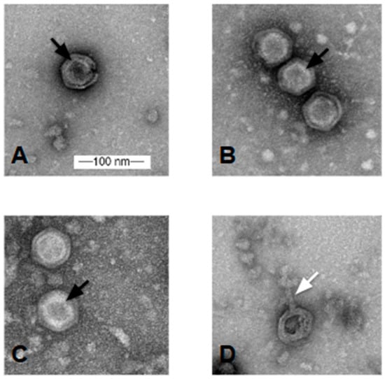 High titer phage lysates were concentrated by centrifugation as described previously [,,]. For negative staining analysis, phage particles were spotted onto formvar and carbon-coated 400 mesh copper grids, rinsed with distilled water, and stained with 1% uranyl acetate. Grids were imaged with a JEOL JEM 1400 transmission electron microscope at 100 kV acceleration voltage (JEOL, USA, Ltd., Peabody, MA, USA). Images were captured on an EMSIS Veleta side-mounted 2K × 2K CCD camera (Olympus-SIS, Munich, Germany).