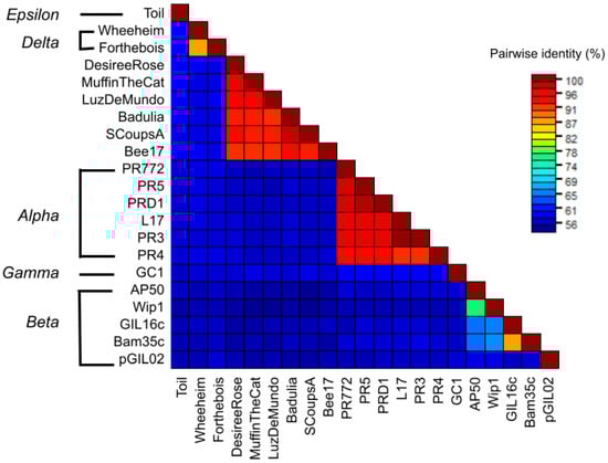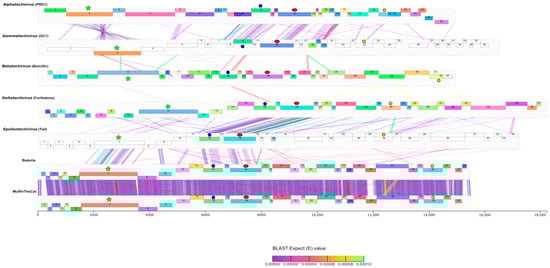 Comparative genome maps were constructed using Phamerator [] (https://phamerator.org (accessed on 1 October 2024)) to display blastn alignments or an Observable notebook (https://observablehq.com/@cresawn-labs/phamerator-map) to display tblastx alignments.