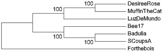 - Kumar, S.; Stecher, G.; Tamura, K. MEGA7: Molecular Evolutionary Genetics Analysis Version 7.0 for Bigger Datasets. Mol. Biol. Evol. 2016, 33, 1870–1874. [Google Scholar] [CrossRef] [PubMed]