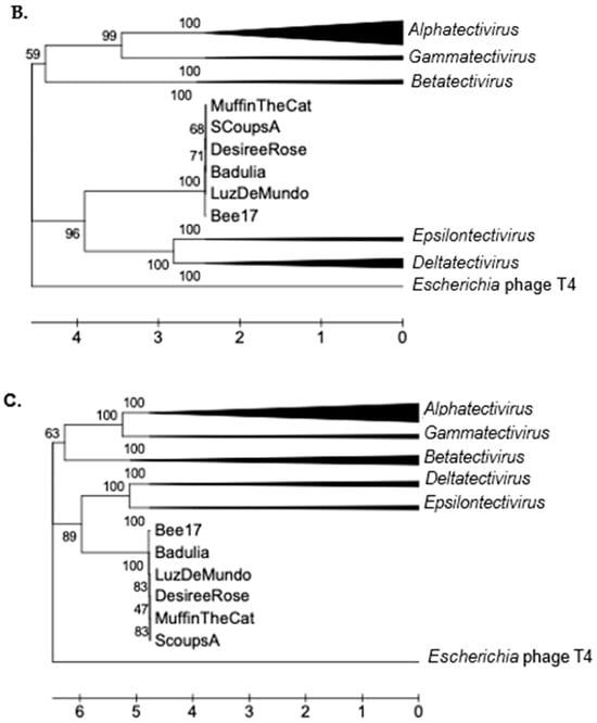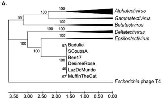 Whole genome comparison was carried out using tectivirus complete genome nucleotide sequences retrieved from NCBI (accession numbers listed in Table 1) and Forthebois was included as an outgroup (MK620900.1). Tectivirus protein sequences (DNA polymerase, major capsid, and DNA packaging ATPase) were retrieved from NCBI Virus [], omitting those sequences that have not been assigned a genus or classified as a particular protein. A T4 bacteriophage protein was included in each multiple alignment for an outgroup.