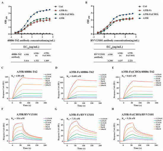 Characterization of affinity and binding kinetics analysis for A35R-Fc chimeric protein with different A35R-specific antibodies. (A,B) Binding of the A35R-Fc chimeric protein to antibody 40886-T62 (A) or RVV13101 (B) by enzyme-linked immunosorbent assay (ELISA). Ctrl represented negative control (BSA). The commercial A35R protein is the positive control. (C–H) Characterization of the affinity of A35R, A35R-Fc, or A35R-Fc (CHO) with antibody 40886-T62 (C–E) or RVV13101 (F–H) using SPR. The actual responses (colored lines) are shown. The equilibrium dissociation constant KD was calculated as kd/ka. The EC50 was calculated by fitting the OD450 values from serially diluted antibody 40886-T62 or RVV13101 to a sigmoidal dose–response curve.