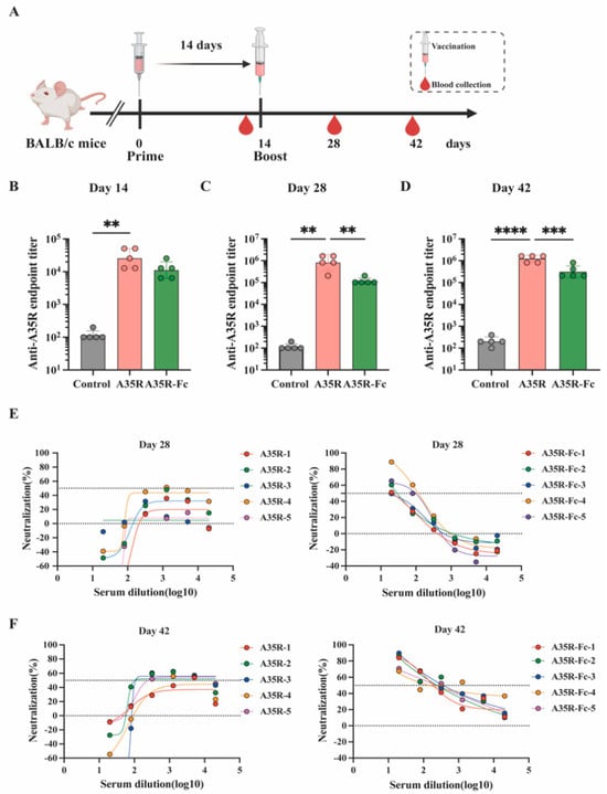 Female BALB/c mice (n = 5 per group, 6–8 weeks old) were purchased from Guangdong GemPharmatech and housed in a specific pathogen-free (SPF) environment. The mice were intramuscularly immunized twice, 14 days apart, with equimolar amounts of either 5 μg of commercial A35R (Antibody system, Franch, Cat. #EVV13101, expression system: mammalian cells) or 15 μg of A35R-Fc protein, each combined with 10 μg of CPG1018 and 100 μg of alum adjuvant. Mice immunized with PBS mixed with equal amounts of CPG1018 and alum adjuvant served as controls. Blood samples were collected on days 0, 14, 28, and 42 post-initial immunization to assess serum A35R-specific antibody levels.