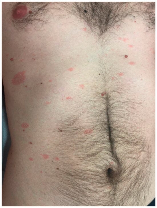 Pruritus is usually mild or absent [1]. The onset of PR is characterized by a single, erythematous macule or papule mainly on the trunk that enlarges over a few days, developing a medallion-like, scaly patch or plaque (“mother patch” or “herald patch”). This initial lesion has a depressed center and a raised border with a “collarette” of scales attached to the periphery with its free edge extending internally [1,2,3]. The herald patch (HP), which is usually asymptomatic, is followed after about two weeks by a secondary eruption consisting of smaller papulosquamous lesions along the cleavage lines of the skin in a distribution that resembles a “Christmas tree” or “theatre curtain” pattern on the trunk, mainly when it affects the back [1,3]. The face, scalp, palms, and soles are usually spared, and maculopapular, erythematovesicular, and petechial oropharyngeal lesions may be present (28% of cases) [20]. Differential diagnoses include secondary syphilis, nummular eczema, guttate psoriasis, tinea corporis, pityriasis versicolor, pityriasis lichenoides chronica, and atypical exanthems due to Epstein Barr virus, Parvovirus B19, [1,3,21,22,23,24] or to other virus infection/reactivation [1,3].