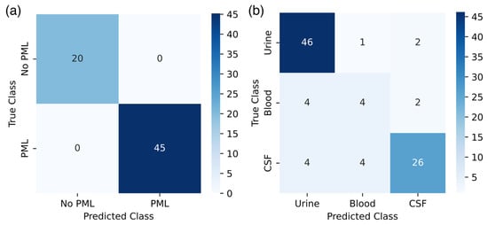 After k-fold CV, new instances of each model type were established and trained on the normalized count frequency-encoded 6-mer data and evaluated using the testing data described above. The model-predicted labels based on the test dataset for each model (PML dataset, n = 65; tissue dataset, n = 93) were compared to the corresponding true labels for PML status (Figure 2a) and tissue source (Figure 2b). Results were used to determine the classic specific and macro-averaged accuracy, precision, recall, and the F1 score for each model (Table 2). Diagonal values denote the number of model predictions that were the same as the true labels, whereas off-diagonal values are test points incorrectly classified by the model. The PML model yielded an average accuracy of 100% and an F1 score of 1.00 in predicting the patient PML status for samples in the test dataset (Table 2), where the model correctly identified 45 PML sequences and 20 No PML sequences (Figure 2a). The tissue source prediction model achieved an overall accuracy of ~88% and an average F1 score of 0.709 (Table 2). While there was little variability in the accuracy among the different tissue sources, the F1 score varied greatly by class, ranging from 0.893 in the urine to 0.421 in the blood (Table 2). Of the 49 urine samples, 10 blood samples, and 34 CSF samples included in the test set, the model correctly identified 46 urine samples, four blood samples, and 26 CSF samples (Figure 2b).