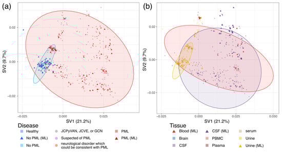 Features of the NCCR sequences were further explored using spatial visualization of the dimensionally reduced 6-mer normalized frequency matrix via SVD, revealing distinct groupings by patient PML status and viral tissue source (Figure 3). From the SVD plot depicting PML status, there is an apparent tight grouping of No PML sequences and a resulting small 95% confidence ellipse (Figure 3a), indicating that the No PML NCCR sequences exhibit minimal k-mer variation. This clustering corroborates with NCCR sequences of healthy individuals undergoing infrequent mutation [9,12]. Conversely, the PML sequences were much more spread out, and this greater variation was reflected in a larger 95% confidence ellipse (Figure 3a). The greater variation in NCCR k-mer composition aligns with detecting mutations in PML-associated NCCR sequences [25,29,30]. Combined with the tissue classifications, there appears to be a population of sequences from the urine of PML patients within the urine 95% confidence ellipse adjacent to, yet distinct from, sequences from the urine of No PML patients (Figure 3), suggesting the emergence of quasispecies in the urine of PML patients.