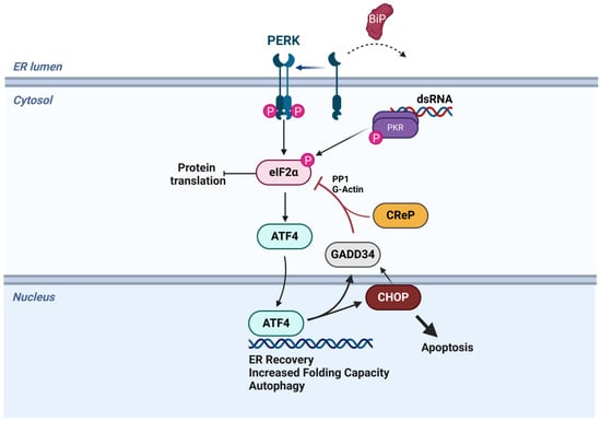 Diagram of the PERK and PKR pathways from the integrated stress response. Following activation of either PERK or PKR, serine 51 on eIF2α is phosphorylated, leading to translational attenuation and the upregulation of ATF4 translation. ATF4 induces a number of recovery responses. GADD34 and CReP promote eIF2α dephosphorylation to restart translation, and CHOP is a pro-apoptotic transcription factor that promotes death in terminally stressed cells. Created with BioRender.com.