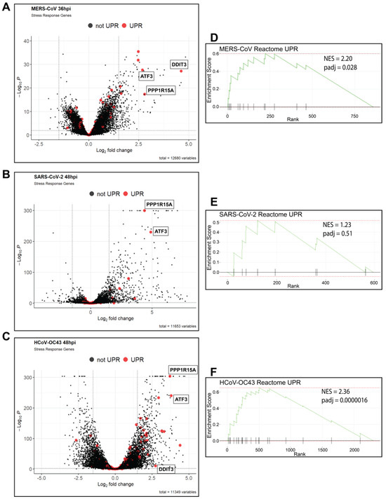 To understand how different betacoronaviruses interact with the host, we analyzed previously published [34] transcriptomic RNA sequencing (RNA-seq) data from infected A549 lung cell lines expressing either dipeptidyl peptidase 4 (A549DPP4) to facilitate MERS-CoV infection or angiotensin-converting enzyme 2 (A549ACE2) for SARS-CoV-2 infection and HCoV-OC43. In all infections (MOI = 1 PFU/cell), we observed a distinct upregulation of the unfolded protein response (UPR) genes, especially PERK-regulated genes. Volcano plots were generated for each dataset, with selected UPR-regulated genes for MERS-CoV (Figure 2A), SARS-CoV-2 (Figure 2B), and HCoV-OC43 (Figure 2C) highlighted in red. HCoV-OC43 infection significantly upregulated the largest number of UPR-related genes (Figure 2C) compared to SARS-CoV-2 (Figure 2B) or MERS-CoV (Figure 2A). However, all three viruses strongly upregulated three PERK/ISR-regulated genes (labeled in Figure 2): ATF3 [41]; DNA damage-inducible transcription factor 3 (DDIT3), encoding CHOP; and PPP1R15A, encoding GADD34 [1]. As we recently reported, SARS-CoV-2 failed to induce IRE1α-regulated genes (Figure 2B) while MERS-CoV and HCoV-OC43 did [34]. Gene set enrichment analysis (GSEA) also showed significant upregulation of UPR-related genes during MERS-CoV (Figure 2D) and HCoV-OC43 (Figure 2F) infection, while SARS-CoV-2 (Figure 2E) did not significantly enrich this pathway.