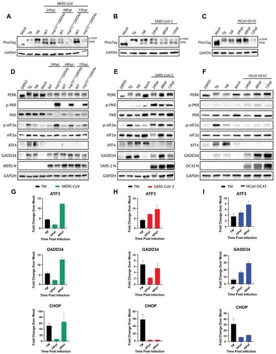 MERS-CoV, SARS-CoV-2, and HCoV-OC43 all activate PERK and downstream signaling during infection. In all blots (A–F), thapsigargin (Tg, 1 μM treatment for 1 h) and tunicamycin (TM, 1 μg/mL treatment for 8 h) served as positive controls, while DMSO (0.1%) served as a vehicle control. Cells (A—A549DPP4; B,C—A549ACE2) were infected with the indicated viruses (MOI = 5PFU/cell) or mock-infected, and whole-cell lysates were collected at the indicated timepoints. (A–C) Extracted proteins were resolved in SDS-polyacrylamide gels containing 50 μM Phosbind acrylamide and Mn2+ to separate phosphorylated and unphosphorylated proteins. Gels were transferred and immunoblotted for PERK (top gel—PhosTag). GAPDH run by standard SDS-PAGE served as a loading control. (D–F) Western immunoblots were performed by standard SDS-PAGE for the indicated proteins. (G–I) Cells were treated with DMSO or 1 μg/mL tunicamycin (TM) for 8 h before total RNA was extracted. (G) A549DPP4 cells were mock-infected or infected at MOI = 5 PFU/cell with MERS-CoV, and total RNA was extracted at the indicated timepoints. (H,I) A549ACE2 cells were mock-infected or infected with SARS-CoV-2 (H) or HCoV-OC43 (I) at MOI = 5 PFU/cell, and total RNA was collected at the indicated timepoints. Expression of the indicated genes was determined using RT-qPCR, with fold change over mock values being calculated as 2−Δ(ΔCt).
