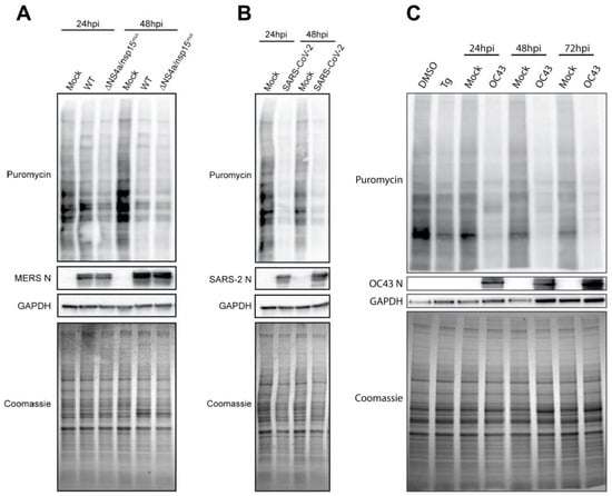To understand the impact on overall translation in cells infected with each betacoronavirus, we utilized puromycin incorporation to visualize nascent peptide production. Cells were infected with each virus (MOI = 5 PFU/cell), and at the indicated timepoints, puromycin was added to the media for incorporation into nascent peptide chains. Whole-cell lysates were then collected, subjected to immunoblotting, and stained with an antibody raised against puromycin as a measure of total protein translation and with viral nucleocapsid (N) antibody, which served as a marker of infection and a readout of viral protein synthesis [19]. Tg treatment served as a positive control for ER stress and p-eIF2α-mediated translational attenuation (Figure 4C).