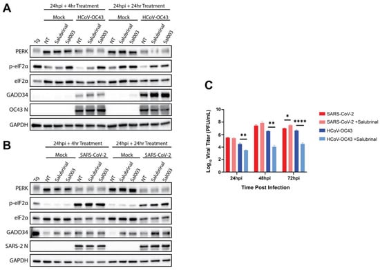 We began by assessing the effects of salubrinal on HCoV-OC43 and SARS-CoV-2 infection because these two viruses induced different eIF2α phenotypes while being able to replicate within the same A549ACE2 cell line. Cytotoxicity of salubrinal was determined in A549ACE2 cells after 48 h of treatment. We determined that salubrinal is not toxic at concentrations below 160 μM (CC50 ≥ 160 μM) (Figure S1A). Additionally, the EC50 for HCoV-OC43 was determined to be 2.58 μM (Figure S1B). However, a sharp decline in HCoV-OC43 titers was observed at 20µM salubrinal (Figure S1B). This matches with literature reporting the approximate IC50 value of salubrinal for inhibiting GADD34 in cells to be 15µM. Based on these data and the common use of 20 µM of salubrinal in the literature, [49,50], we used this dose in our experiments. Thus, cells were mock-infected or infected with HCoV-OC43 or SARS-CoV-2 (MOI= 5 PFU/cell) and incubated for 24 h to establish viral infection before 20 µM salubrinal or Sal003 [49], a salubrinal derivative with a similar function, was added for 4 or 24 h. Whole-cell lysates were collected and analyzed by immunoblot (Figure 5A,B). HCoV-OC43 and SARS-CoV-2 activated PERK and induced GADD34 expression with or without inhibitor treatment. However, during HCoV-OC43 infection, salubrinal or Sal003 treatment was required to induce p-eIF2α, confirming that this inhibitor can promote p-eIF2α (Figure 5A). In contrast, immunoblots of SARS-CoV-2-infected cells demonstrated no difference in p-eIF2α induction, with or without drug treatment (Figure 5B).