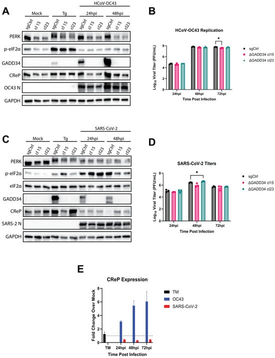 The sgCtrl generated clone and both GADD34-KO clones were infected with SARS-CoV-2 or HCoV-OC43 (MOI = 2 PFU/cell). Infected cells showed robust PERK activation, as assessed by immunoblot analysis of whole-cell lysates harvested from cells following treatment with Tg or infection with HCoV-OC43 (Figure 6A) or SARS-CoV-2 (Figure 6C). Phosphorylation of eIF2α was also detected following Tg treatment and over the course of SARS-CoV-2 infection (Figure 6C). No consistent impact on SARS-CoV-2 infectious virus production was observed over the time course (Figure 6D). However, p-eIF2α was not induced during HCoV-OC43 infection of sgCtrl cells nor in infections of both GADD34-KO clones (Figure 6A). Thus, GADD34 KO does not appear to significantly alter the phosphorylation state of eIF2α during HCoV-OC43 or SARS-CoV-2 infection. Loss of GADD34 also failed to consistently reduce HCoV-OC43 titers in either knockout clone, with the single small but statistically significant difference at 72 hpi most likely not being a biologically significant reduction (Figure 6B). This suggests that our hypothesis regarding the role of GADD34 in HCoV-OC43 infection is incorrect.