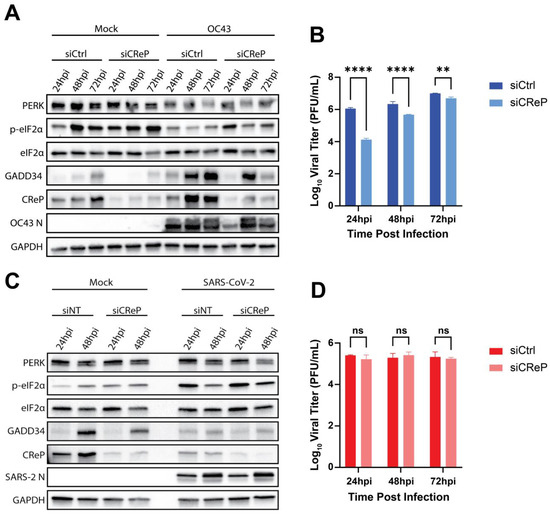 To investigate the role of CReP in betacoronavirus replication, we utilized siRNA to knock down (KD) CReP expression in A549ACE2 cells before infecting with HCoV-OC43 or SARS-CoV-2. CReP protein levels were efficiently reduced compared to treatment with a scrambled siRNA control (siCtrl) (Figure 7A,C). Seventy-two hours after siRNA transfection, cells were infected with HCoV-OC43 or SARS-CoV-2 (MOI = 2 PFU/cell) for the indicated times, and whole-cell lysates were collected and analyzed by immunoblotting. During the infection of siCtrl-treated cells with HCoV-OC43, we observed a decrease in p-eIF2α levels below the background of mock-infected siCtrl cells. Knockdown of CReP was maintained through the course of infection and led to an increase in p-eIF2α levels, particularly at 24 hpi (Figure 7A). This increase in p-eIF2α at 24 hpi also corresponded with a notable decrease in HCoV-OC43 N protein. CReP KD also reduced HCoV-OC43 titers by approximately 100-fold at 24 hpi, with the defect decreasing to only 10-fold at 48 hpi and 3-fold at 72 hpi (Figure 7B). We hypothesize that this diminishing effect on viral replication as the infection progresses may be due to CReP upregulation paired with siRNA turnover. These data, as well as the significant impact of salubrinal treatment on HCoV-OC43 replication (Figure 5C), leads us to conclude that HCoV-OC43 preferentially promotes eIF2α dephosphorylation and viral replication through CReP rather than GADD34.