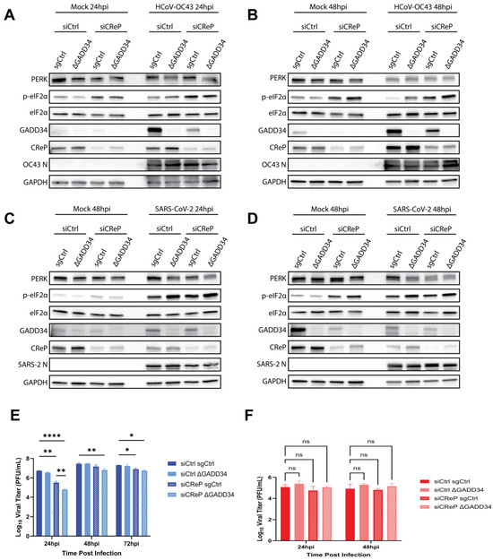 CReP knockdown in GADD34-knockout cells has a combinatorial effect on HCoV-OC43 replication. A549ACE2 sgCtrl cells or GADD34-KO cells (clone 23—ΔGADD34) were treated with control siRNA (siCtrl) or CReP-targeting siRNA (siCReP) for 72 h before being infected with HCoV-OC43 (A,B,E) or SARS-CoV-2 (C,D,F) at MOI = 2 PFU/cell. At the indicated timepoints, whole-cell lysates (A–D) or supernatants (E,F) were collected. (A–D) Western immunoblots for the indicated proteins were performed from HCoV-OC43-infected cells (A,B) or SARS-CoV-2-infected cells (C,D). (E,F) Infectious virus was quantified by plaque assay from HCoV-OC43-infected samples (E) and SARS-CoV-2-infected samples (F). Solid lines indicate siCtrl treatment, while dashed lines represent siCReP treatment. Statistics by 2-way ANOVA. * = p < 0.05; ** = p < 0.01; **** = p < 0.0001; ns = not significant.