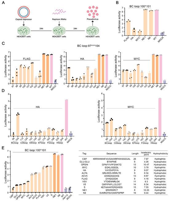 Establishment of a pseudovirus system to screen insertion sites and types of tags. (A) Schematic diagram of pseudovirus packaging experiment. (B) Activity detection of pseudoviruses introducing the common tags FLAG, HA, MYC, and exogenous peptides NE1 and N6 to the 100th site of the EV-A71 VP1 BC loop region. (C) Activity detection of pseudoviruses introducing tags FLAG, HA, and MYC to the 97–104th sites in the entire BC loop region of EV-A71 VP1. (D) Activity detection of pseudoviruses introducing tags HA and MYC to the N-terminal or C-terminal ends of various loop regions (BC, CD, DE, EF, FG, and HI) of the EV-A71 capsid protein VP1. (E) Activity detection of pseudoviruses introducing other small tags to the 100th site of the EV-A71 VP1 BC loop region (left table). Comparison analysis of the size, isoelectric point, and hydrophobicity of all introduced tag sequences (right panel).