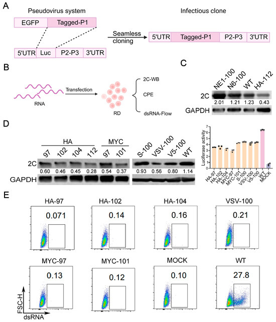 Construction of infectious clones based on the screening results of pseudoviruses. (A,B) Schematic diagram of the construction and reverse genetics rescue of recombinant EV-A71 infectious clones. (C,D) RD cells were transfected with tagged viral RNA for 24 h. After transfection, cells were lysed, and EVA71-2C” to “EV-A71 2C protein” was determined by Western blotting. The values on the graph represent the expression levels of viral 2C protein normalized by GAPDH. (E) RD cells were infected with recombinant viruses EV-A71-HA-97, EV-A71-HA-102, EV-A71-HA-104, EV-A71-MYC-97, EV-A71-MYC-101, and EV-A71-VSV-100 for 48 h, and viral dsRNA was detected by flow cytometry, with MOCK as a blank control.
