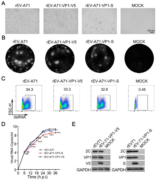 Virological characteristics of recombinant viruses rEV-A71-S and rEV-A71-V5. (A) RD cells were transfected with rEV-A71-VP1-S, rEV-A71-VP1-V5, and parental rEV-A71 viral mRNA, and cytopathic effect was observed after 24 h, with MOCK as a blank control. (B) Plaque morphology of rEV-A71-VP1-S, rEV-A71-VP1-V5, and parental rEV-A71 virus after infection of RD cells, with MOCK as a blank control. (C) RD cells were infected with rEV-A71-VP1-S, rEV-A71-VP1-V5, and parental rEV-A71 at an MOI of 1 for 6 h, and viral dsRNA was detected by flow cytometry, with MOCK as a blank control. (D) One-step growth curves of rEV-A71-VP1-S, rEV-A71-VP1-V5, and parental rEV-A71. RD cells were infected with rEV-A71-VP1-V5, rEV-A71-VP1-S, and parental rEV-A71 at an MOI of 0.1. At 6, 12, 18, 24, 30, and 36 h, the viral genomic RNA was extracted and then measured by qPCR. Statistical differences were determined by t-test. * represents p < 0.05; ** represents p < 0.01; and *** represents p < 0.001. Data are means ± SD of three replicate samples. (E) RD cells were infected with rEV-A71-VP1-S and parental rEV-A71 at an MOI of 0.1 for 12 h. After infection, cells were lysed, and EVA71-2C, VP1, V5, and S were determined by Western blotting, with MOCK as a blank control.