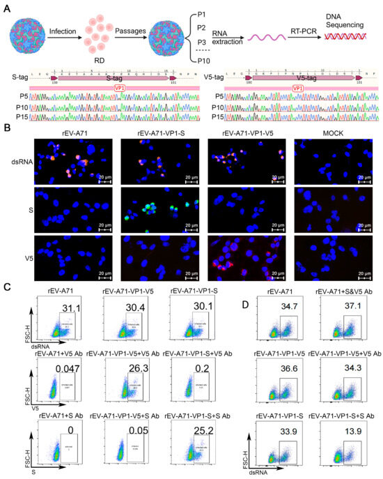 The aforementioned protein immunoblotting confirmed the specificity of the epitope. Next, we wondered if an epitope-specific antibody could enable the detection of infected viruses through immunofluorescence and flow cytometry assays. Indeed, the rEV-A71-VP1-V5 recombinant was specifically recognized by the V5 tag antibody, and the rEV-A71-VP1-S was specifically recognized by the S tag antibody (Figure 4B,C). The immunofluorescent image revealed that all the virus capsid proteins were distributed in the cytoplasm, aligning with the known intracellular location of the virus.