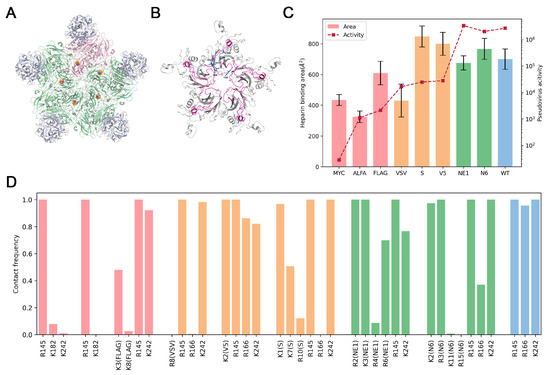 Finally, we aim to comprehend the factors that influence the creation of viral recombinants with epitope tags on the capsid proteins. To this end, the inserted epitope must not disrupt the functions of the capsid, such as receptor binding and virus assembly. In fact, the structure analysis of the EV-A71 capsid revealed that, among the various loop regions of VP1, the BC loop is centrally positioned and does not directly participate in the interactions between viral capsid proteins. Furthermore, the 100th amino acid site on VP1, situated at the apex of the BC loop and facing the canyon region, is distant from any potential interfaces critical for virus assembly or virus interactions with its receptor SCARB2 (Figure 5A and Figure S4). Next, we aim to delve into the reasons why not all epitopes inserted at this particular site resulted in the generation of viable recombinant viruses. Since the BC loop is near the five-fold axis, which is the primary binding region of the EV-A71 attachment receptor, heparan sulfate [30,31]. We speculated that the insertion of tags might affect heparin binding, thereby impacting viral activities. To investigate this, we modeled various VP1-tag pentamer structures, performed molecular docking to heparin, and ran 200 ns MD simulations of the complexes. Since all the previously reported heparin binding sites are on the BC, DE, and HI loop regions, residues from the other regions were blocked during docking and constrained during MD simulations (Figure 5B). We calculated the binding surface area between VP1 pentamers and heparin, which was 699.7 Å2 for the wild-type. For the negative-tagged types, the binding area decreased significantly: 324.4 Å2 for ALFA, 434.3 Å2 for MYC, and 609.2 Å2 for FLAG, suggesting that tag insertion substantially weakened the interaction with heparin. In comparison, the binding area of the positive-tagged types was equivalent to (NE1 and N6) or larger than (V5 and S) that of the wide type (Figure 5C).