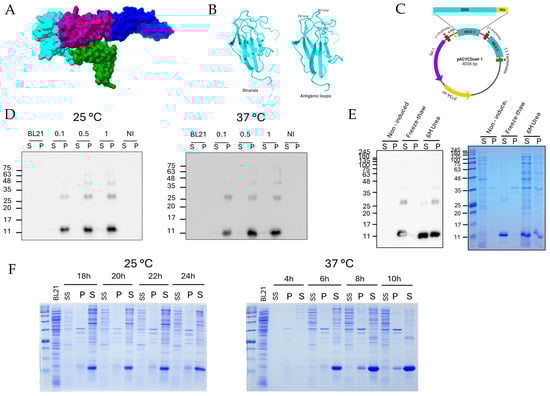 Dengue EDIII cloning and expression in E. coli. (A) Envelope protein domains (Purple-Domain I, Blue-Domain II, Cyan-Domain III, and Green-Stem domain). (B) Envelope domain III strands and antigenic loops. (C) The EDIIII gene was cloned into MCS1 of the pACYCDuet1 vector. (D) The cloned plasmid was transformed into E. coli BL21 strain, the expression of EDIII protein was analyzed under different IPTG concentrations (1 mM, 0.5 mM, and 0.1 mM) in LB medium, and samples prepared in mild buffer were analyzed using Western blotting. (E) Insoluble EDIII protein expressed as inclusion bodies were solubilized using two different methods: freeze–thaw and 6 M urea buffer, followed by an analysis of the solubility of EDIII using Western blotting and SDS-PAGE. (F) The EDIII protein was expressed in autoinduction media at different temperatures and times following analysis of the harvested samples by SDS-PAGE. (S: supernatant, P: pellet, SS: sample sonicated supernatant with PBS, NI: Non-induced).