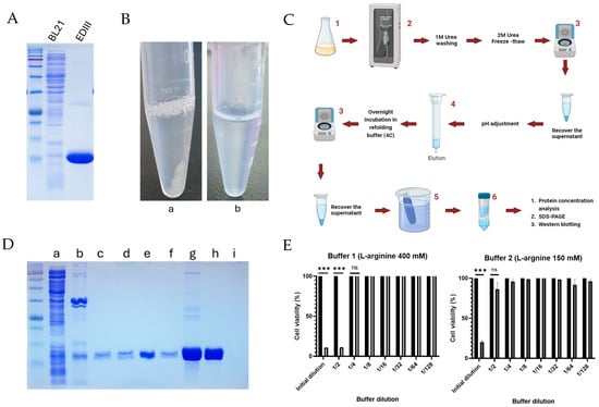 Purification of EDIII protein and elimination of protein aggregates. (A) The EDIII protein was purified using His affinity purification, and the purity was analyzed by SDS-PAGE. (B) Visibility of insoluble protein aggregates in purified proteins (a) and absence of protein aggregates in properly refolded proteins in L-arginine buffer (b) after storage at 4 °C. (C) Schematic representation of protein expression, purification procedures, and dialysis for elimination of protein aggregates. 1—E. coli 50 mL culture in autoinduction media; 2—Sonication; 3—centrifugation at 19,000× g for 15 min; 4—His affinity purification; 5—dialysis in refolding buffer; 6—concentration of proteins using Amicon centrifugal filter units. (D) Samples from different purification steps were analyzed using SDS-PAGE. a—sonicated supernatant; b—pellet after freezing and thawing in 2 M urea; c—supernatant after freezing and thawing in 2 M urea; d—protein after refolding in refolding buffer; e—His affinity purified eluate; f—proteins after dialysis in refolding buffer; g—aggregated or dimerized proteins eliminated by 30 K Amicon filter; h—non-aggregated monomeric EDIII proteins in the elute of 30 K Amicon filter recovered by 10 K Amicon filter; i—10 K Amicon filter elute. (E) The toxicity of the refolding buffer (buffer 1) and modified refolding buffer (buffer 2) were evaluated in Hela cells. The statistical significance of the control and buffer samples was evaluated using Student’s t-test (p < 0.001 = *** and p ≥ 0.05 = ns).